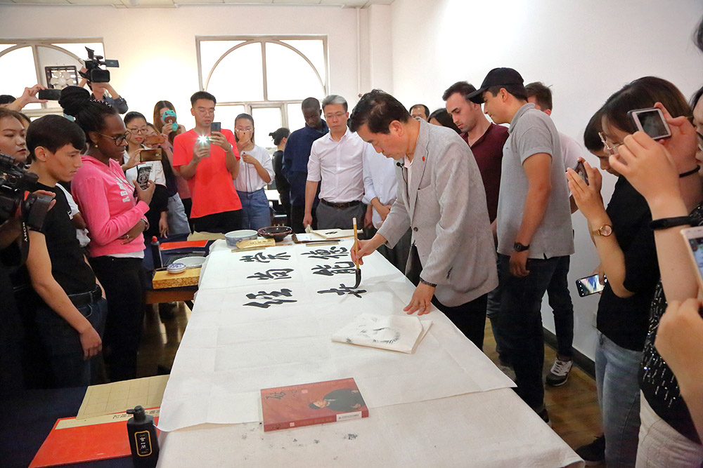 讲座结束后,苏士澍为学校题写了“崇德尚能,经世济民”的八字校训,并参观了文化与传播学院的人文与传媒实验中心。