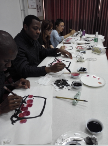 刘雁峰老师通过多媒体向来自世界各国的留学生介绍了中国画的特点、形式、分类、工具,中国历代画家及绘画技法,中国画的文化背景与深厚底蕴等。通过“你问我答”的互动形式,结合体验式的画作临摹,留学生们在欢乐的气氛中,不仅学习了中国画的知识,而且也创作出各具风采的作品。