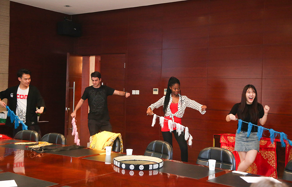 梁曦为大家详细讲解了京剧发展史、京剧基本功等内容,并将京剧服饰、京剧名角介绍的视频穿插其中。“纸上得来终觉浅,需知此事要躬行”,为了更好地体验京剧的乐趣,领会国粹的精髓,留学生们在老师的指导下着蟒袍,戴髥口,舞水袖,摆身段,一招一式学得有板有眼,不亦乐乎。