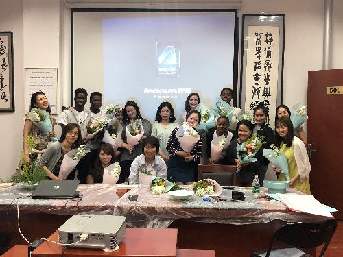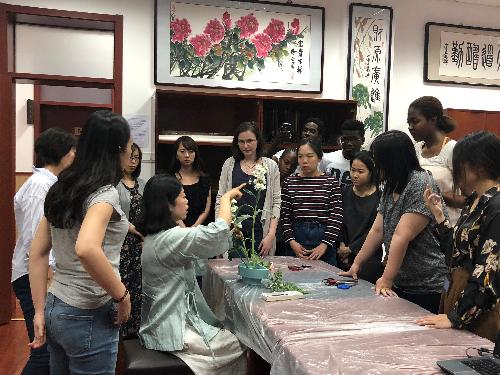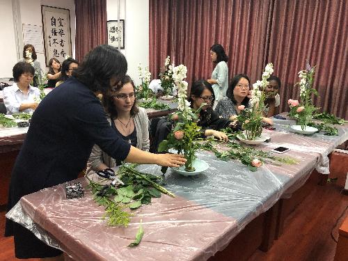 5月30日,在首都经济贸易大学国际学院书画室举行了“与君倾听花开声,携手共筑青春梦”插花艺术讲座,讲座共有来自日本、韩国、泰国、老挝、安哥拉、喀麦隆、阿塞拜疆、保加利亚等多个国家的留学生参加,由中国传统插花入门,后习日本花道,并获得日本小原流花道师范级证书的杨雪老师主讲。