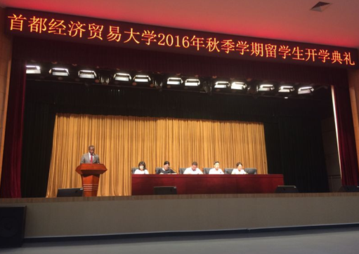 首先院长王少国进行致辞。他代表学院对2016级新生表示祝贺,他希望新生尽快适应中国的人文环境,感受中华文化的博大,理解中国;适应新的校园生活,感受北京的美丽,结识更多的朋友,成为国际友谊的传播者。他祝愿同学们能在首经贸学习期间收获知识,收获友谊和快乐。
