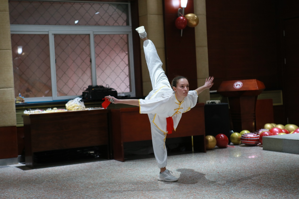 值得关注的是,今年新年晚会增加了很多中国元素,太极拳、京剧、中文歌曲,尤其是来自乌克兰的达莉亚同学带来的长拳和九节鞭表演,震撼了在场师生观众。