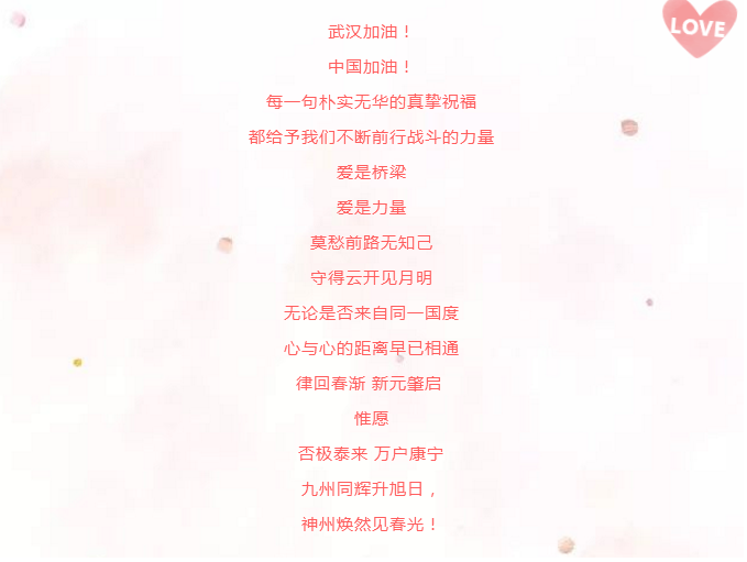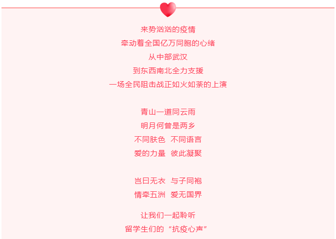 我知道对于中国和世界来说,遭受这种灾难是很困难的。请继续努力,不要失去希望。因为到目前为止您已经救了很多生命。我们是国际学生,始终如一地站在您的身后,我们是能陪着您战胜这个艰难到最后的人。