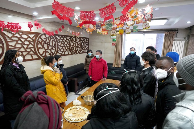 校领导与留学生代表亲切交谈,向留校同学表达节日问候并发放了慰问礼包。