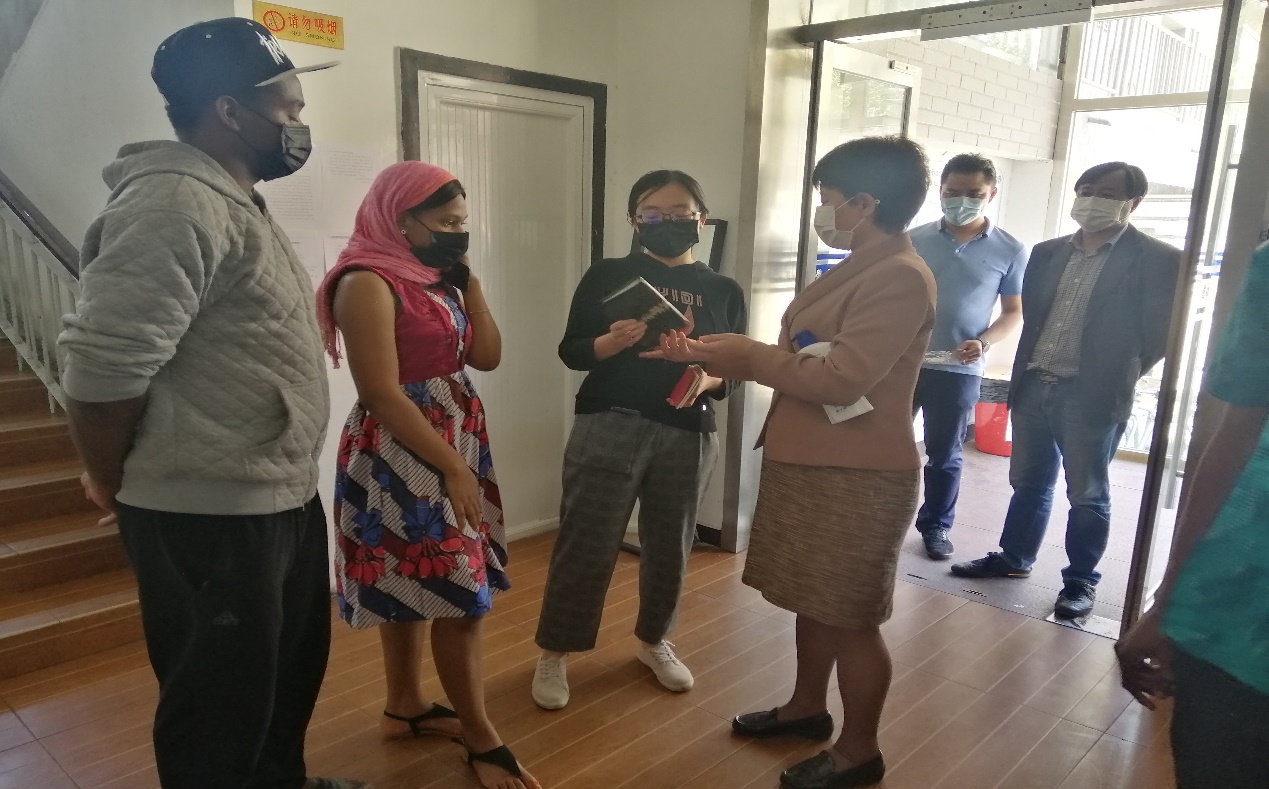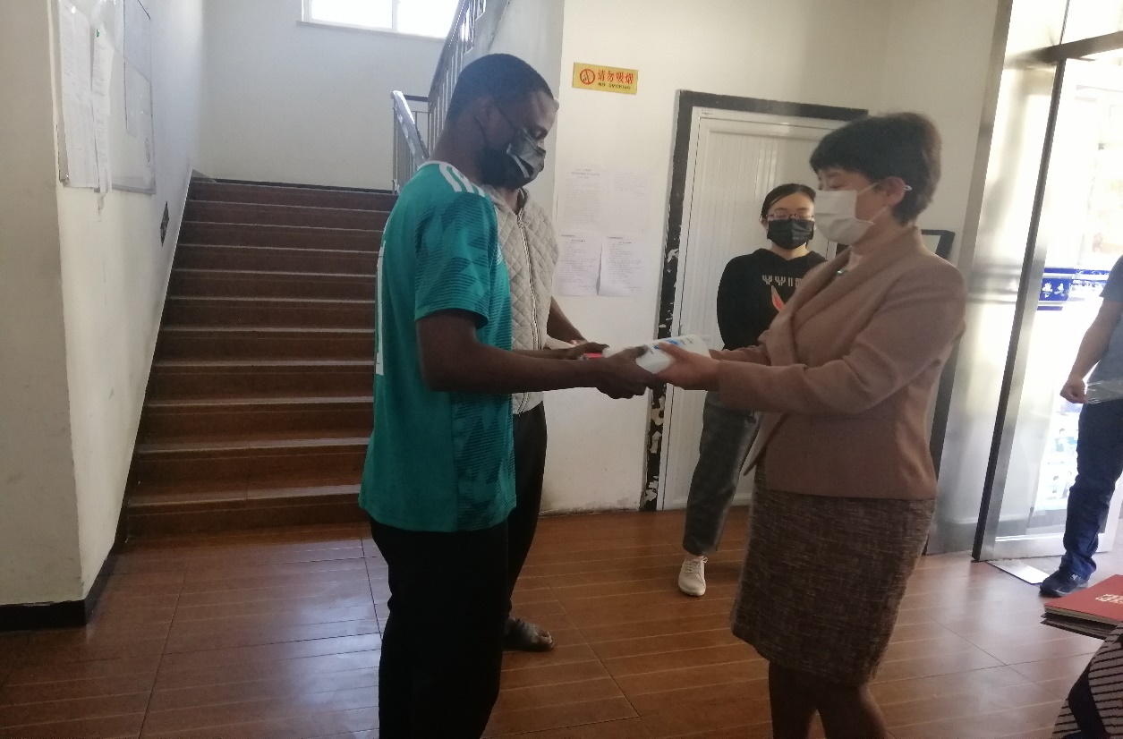 5月12日下午国际学院直属党支部书记何丽、院长助理于佳、办公室主任王银等前往校内2号留学生公寓,慰问部分在校留学生并向其发放防疫物资及学习用品。