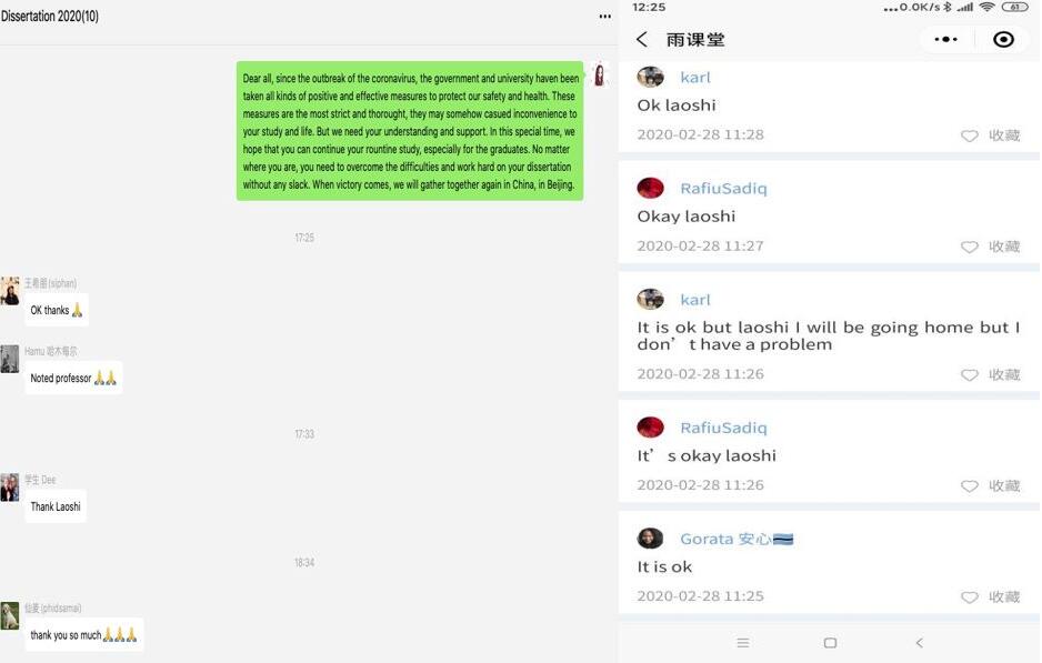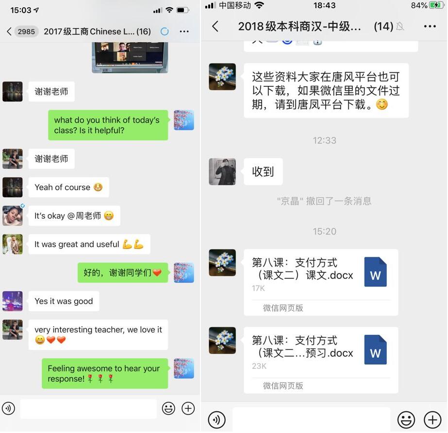 国际学院周磊老师课后了解学生学习情况(左)、国际学院姚京晶老师利用课程微信群发送教学资料(右)