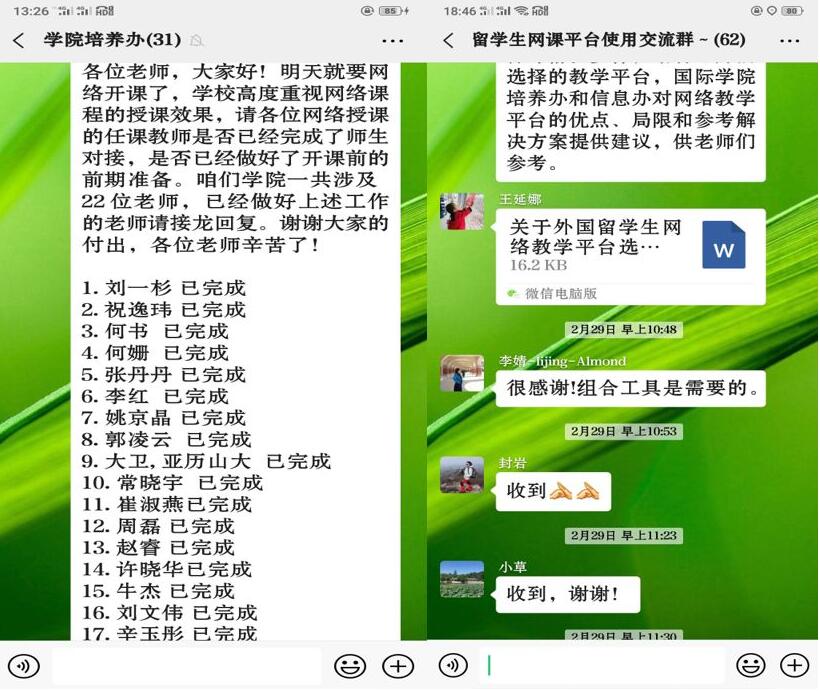 工商管理学院贾汇源老师与留学生微信沟通(左)经济学院李婧老师课后收集留学生学习情况反馈(右)