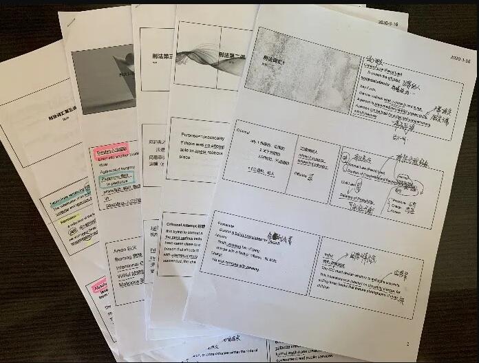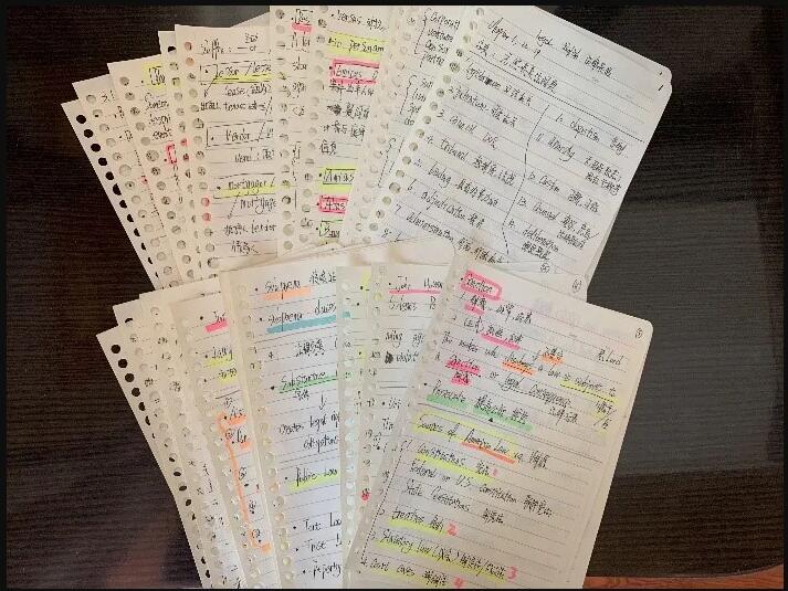我在做笔记的过程中,比较喜欢使用荧光笔去标注一些老师讲课中提到的重点单词或者词语,这样更有利于我对某个法律英语词汇的记忆。同时要在下课后,对着自己的笔记内容再做一遍梳理,根据自己的理解,做一些符号或者分层记录。