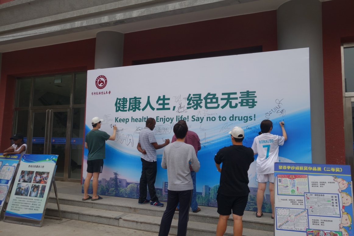 6月26日上午9点半,留学生们陆续来到活动现场,在“健康人生,绿色无毒”的主题板上纷纷签下自己的名字。一个个签名仿佛一句句承诺,留学生们在书写中表达了自己抵制毒品的决心。