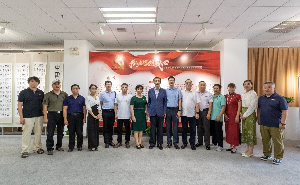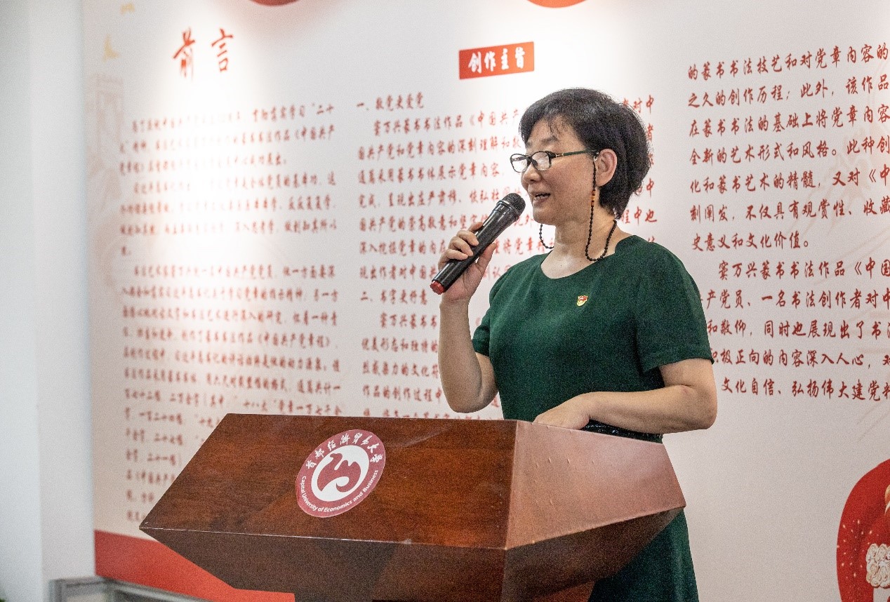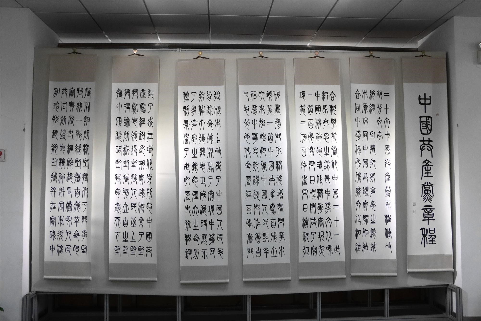 为庆祝中国共产党成立102周年,深入贯彻落实学习“二十大”精神及习近平新时代中国特色社会主义思想主题教育,首都经济贸易大学国际学院在学校红庙校区会展中心主办书法艺术家窦万兴创作的《中国共产党章程》篆书书法作品展,并于6月19日举办开展仪式。