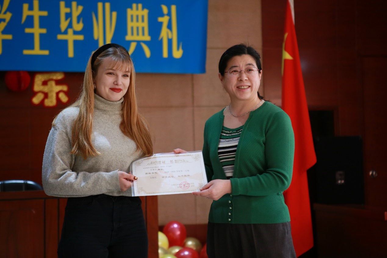 何丽书记和培养办公室主任朱燕红分别代表学院为在本学期获得全勤奖、勤奋奖、HSK优秀奖的语言生颁发获奖证书,为结业学生颁发结业证书。