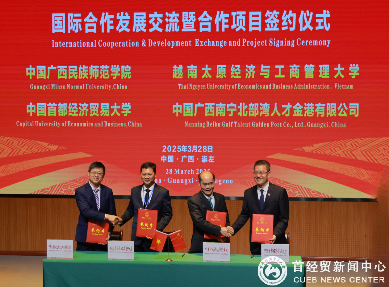3月28日,党委常委、副校长杨奎带队赴广西民族师范学院签署国际教育合作联盟协议及中越校企四方(中国广西民族师范学院、越南太原经济与工商管理大学、中国首都经济贸易大学以及中国广西南宁北部湾人才金港有限公司)合作协议。来自越南、泰国、老挝等东盟国家的政府及高校代表以及广西崇左市政府、高校及企业代表齐聚一堂,共商民族和国际文化交流交融。