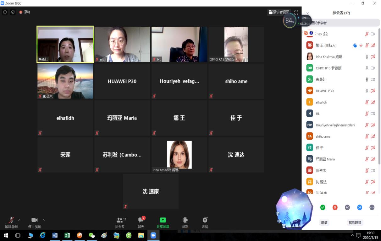 非常时期,特殊会议。5月15日北京时间下午15:00 ,11位本硕博学历留学生班长和语言进修生代表与国际学院领导班子、留学生培养办公室和学院信息办公室工作人员,共18人,在ZOOM平台上召开留学生网络教学意见征询视频会议。会议由培养办主任朱燕红主持。