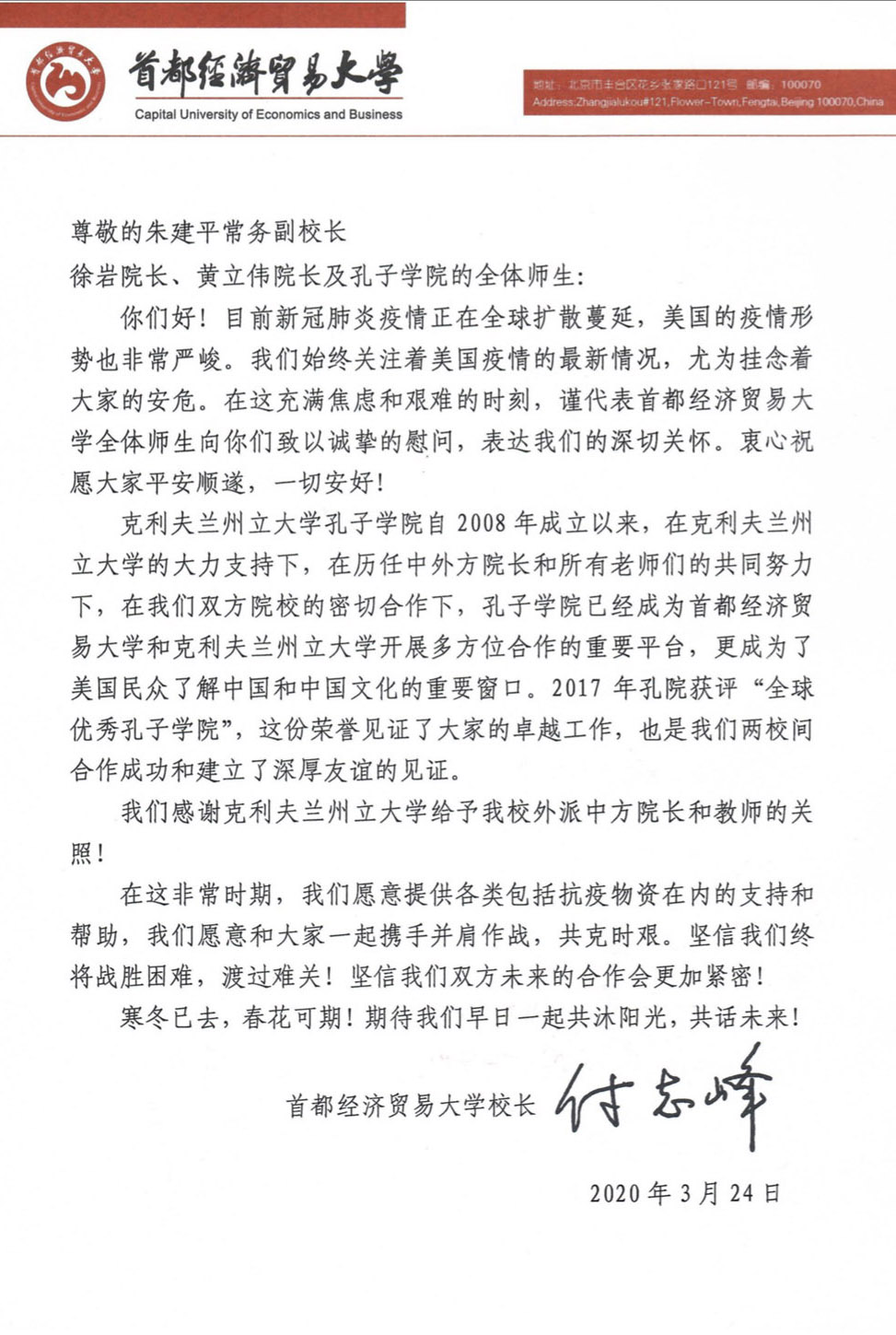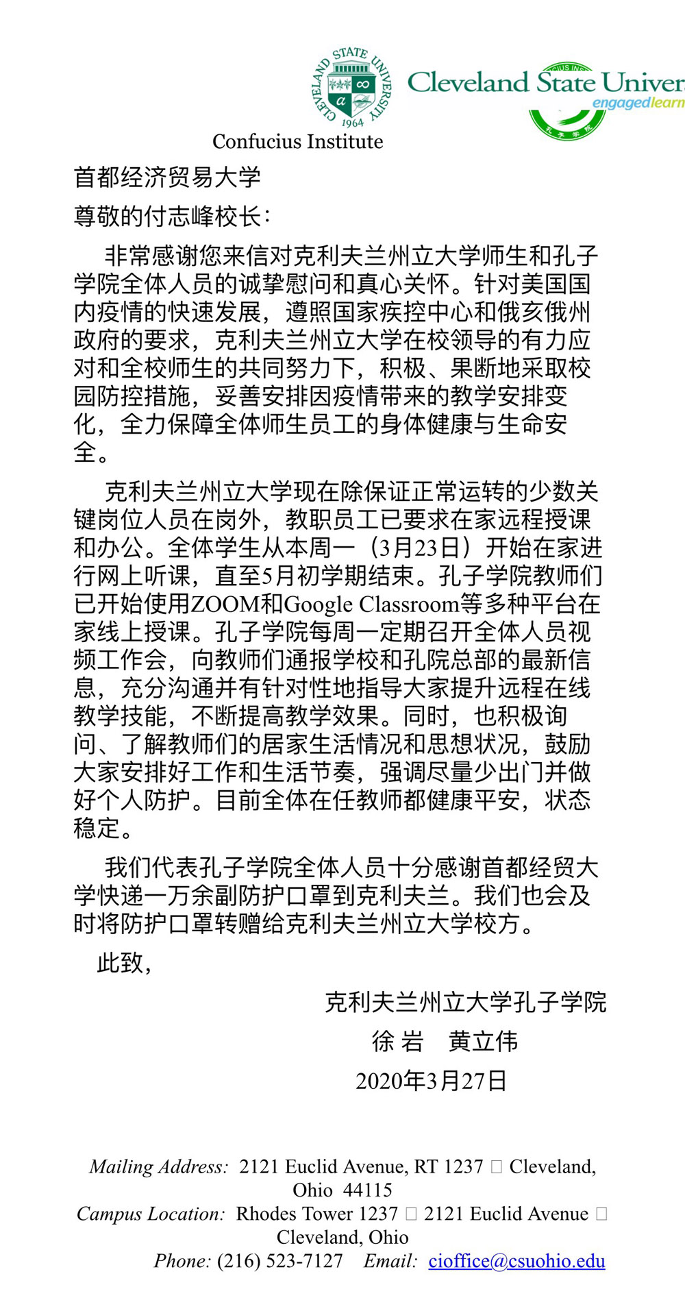美国克利夫兰州立大学孔子学院外方院长徐岩教授和中方院长黄立伟给付志峰校长发来感谢信。感谢首都经济贸易大学和付志峰校长对克利夫兰州立大学师生和孔子学院全体人员的诚挚慰问和真心关怀,特别是对我校及时快递防疫物品表达衷心感谢!