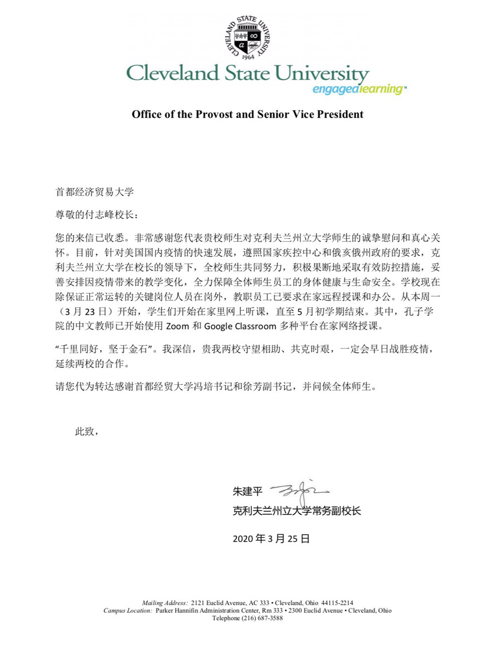 疫情发生以来,学校时刻牵挂着我校美国的友好院校——美国克利夫兰州立大学,牵挂着我们两校共建孔子学院的全体师生,校长付志峰第一时间致信问候。在给克利夫兰州立大学常务副校长朱建平和孔子学院的问候信中,付志峰代表学校对向参与抗疫工作的全体同仁深表关心,他说在这非常时刻,首都经济贸易大学将始终和克利夫兰州立大学以及孔院一起并肩作战,齐心抗疫。他坚信我们终将战胜困难,渡过难关!坚信我们两校未来的合作会更加紧密!