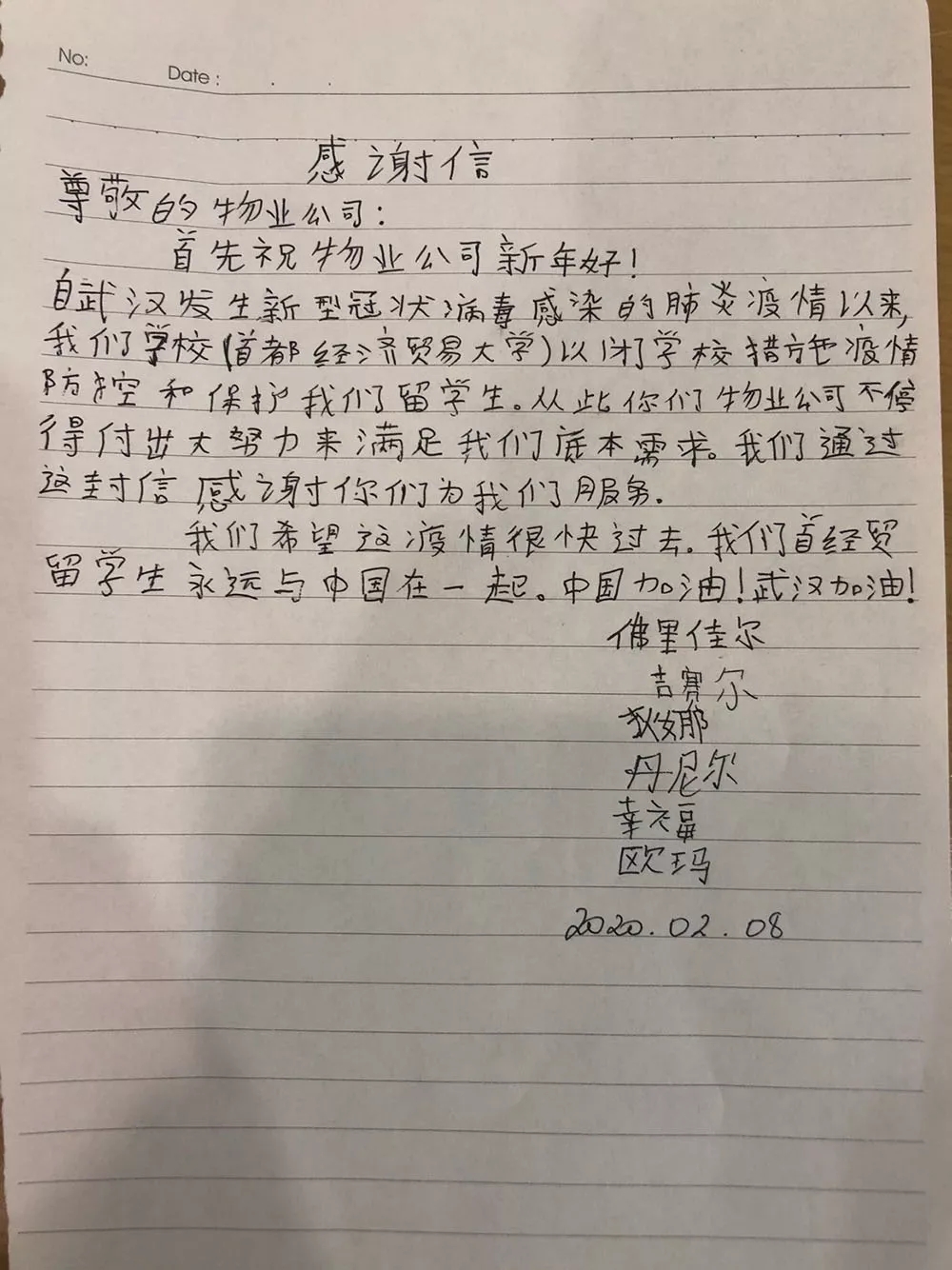 对于在首经贸学习的留学生来说,2020也将成为珍藏的记忆。新冠肺炎疫情发生以来,学校迅速反应积极采取系列管控举措,保障在校师生安全,特别重视在校留学生管理和关爱。资产管理公司和国际学院作为留学生重点保障部门,迅速响应建立工作机制,加强安全、生活保障,加强防控知识宣传和政策解读,保持与学生沟通,了解学生需求,将疫情防控工作和关爱学生落实到每一个细节。
