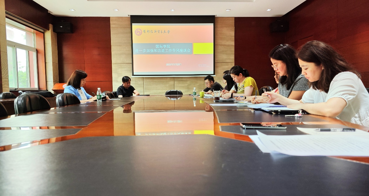 国际学院召开加强和改进工作作风建设座谈会为深入贯彻中央八项规定精神学习教育,持续改进工作作风,提升工作效能,5月20日下午,国际学院召开“进一步加强和改进作风建设座谈会”,全体行政管理干部参加座谈会。国际合作交流直属党支部书记李娟婷、国际学院副院长于佳参加会议。会议由李娟婷主持。2025.05.26 -
